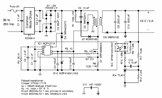 En su Application Note AND8242 / Q a On Semiconductor (www.onsemi.com) describe el diseño de un adaptador para la red de energía que proporciona una salida de 19 V con corrientes hasta 3 A. En este artículo hacemos un resumen que el lector puede encontrarse en este documento, que se puede descargar en formato PDF en el sitio web de la empresa (2008).