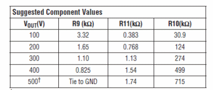 El circuito presentado en la figura 6 consiste en un regulador de alta tensión con salida de 50 V a 500 V utilizando el circuito integrado LT3751 de Linear Techynology (www.linear.com) como base. El circuito opera con tensiones de entrada de 5 V a 24 V y tiene una eficiencia de regulación que pasa del 85%. Las resistencias R9, R19 y R11 tienen valores que dependen de la tensión de salida, debiendo ser consultada la siguiente tabla: