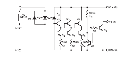 Conforme podemos ver por su circuito equivalente, mostrado en la figura 1, consiste en un LED emisor infrarrojo, ya con un diodo en paralelo y oposición para accionamiento con CA y un circuito amplificador con un paso de salida con colector abierto.