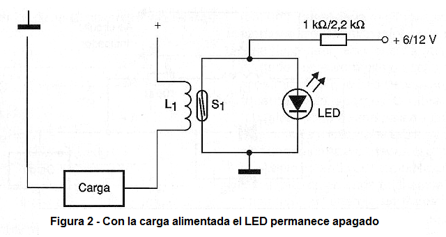 En la figura 2 tenemos una variación de este circuito que opera "al contrario", es decir, un LED indicador se mantiene apagado cuando la corriente está circulando por la carga.