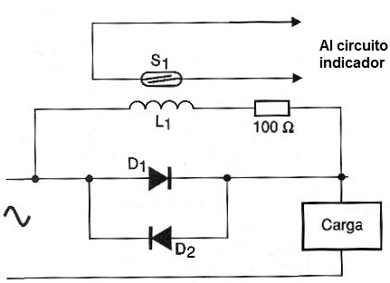 En este circuito la corriente principal pasa a través de los diodos, obteniéndose una caída en los dos sentidos de 0,6 V. La corriente en la bobina del circuito indicador va a ser determinada por su resistencia sumada a la resistencia. La tensión aplicada será de sólo 0,6 V en este circuito.
