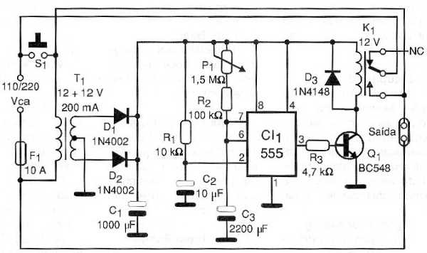 El apagado de un aparato después de un cierto intervalo de tiempo es algo que muchos lectores desear hacer de manera automática. Con la minuteria aquí descrita, eso es posible. El circuito desconecta la carga ya sí mismo después de un intervalo de tiempo de hasta una hora, ajustado en un potenciómetro. Con él, usted puede apagar el televisor automáticamente, aunque duerma, ahorrando energía y no molestar más a los vecinos.