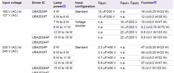 El primer circuito está indicado para las redes de 110 V (a partir de 100 V) y el segundo a 220 V / 240 V. El mismo circuito se aplica a las lámparas de 3 a 18 W.