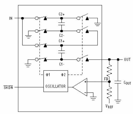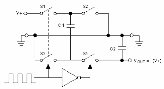 La señal de reloj en la entrada determina la frecuencia de la conmutación de los capacitores. Esta frecuencia dependerá de la corriente en la carga y de los valores de los capacitores usados. En el circuito mostrado tenemos la inversión de la polaridad de la tensión de entrada, con el mantenimiento de su valor. Los cambios en este circuito permiten que se utilice para doblar o dividir por dos la tensión de entrada.