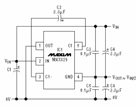 Otra aplicación es en la alimentación de amplificadores operacionales de las nuevas generaciones que pueden operar con tensiones muy bajas. Una configuración básica para este tipo de aplicación se muestra en la figura 2. Este circuito básico, divide por dos la tensión de entrada usando un divisor capacitivo formado por los capacitores C3, C4, C5 y C6. En él, los capacitores se cargan en serie y se descargan en paralelo. Así, conmutando estos capacitores alternativamente se obtiene en la carga mitad de la tensión de entrada.