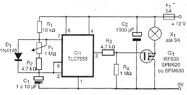 Cuando la carga en el capacitor C1 alcanza 2/3 de la tensión de alimentación se produce la conmutación del circuito integrado. En estas condiciones, el capacitor C1 empieza a descargar ahora vía P2 y resistencia R2 que entonces serán responsables del intervalo entre los intermitentes, o sea, por el tiempo en que la salida del circuito integrado permanece en el nivel bajo y, por lo tanto, el transistor de efecto de campo en el corte. Con el transistor de efecto de campo en el corte no circula corriente por la lámpara que entonces permanece apagada.