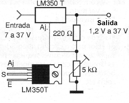La tensión que este componente proporciona en su salida depende de la tensión aplicada en su terminal de referencia o ajuste (AJ). En las aplicaciones normales, un divisor de tensión formado por un trimpot y un resistor, como muestra la figura 1, fijan la tensión de salida que quedará entre 1,2 volts de mínimo a 2 o 3 volts por debajo de la tensión máxima de entrada que es de: 37 volts.