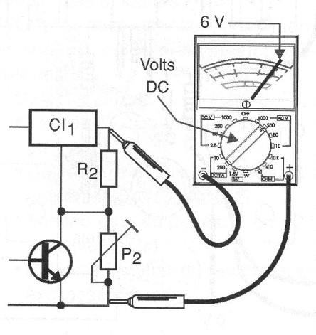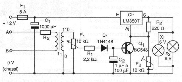 Sin conectar A y B a nada, ajuste P2 para tener en la salida (indicada por el multímetro) una tensión de 6 voltios o de acuerdo con la lámpara usada si la tensión de entrada es mayor.