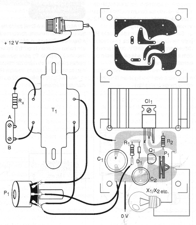 Para evitar este problema indicamos el uso de lámparas de 6 volts, de modo que podamos ajustar en P2 la salida del integrado para este valor cuando haya excitación máxima. Otra posibilidad es utilizar más de 12 volts en la entrada y ajustar P2 para que la tensión en las lámparas de 12 volts sea la correcta.
