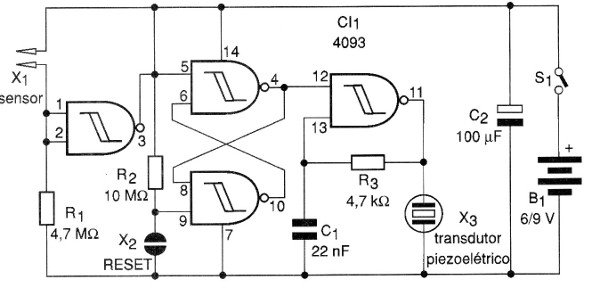 la configuración utilizada es biestable. So. su rearme es hecho por el toque en el sensor X2. Evidentemente, el sensor debe colocarse de tal forma que no se produzca el disparo en caso de lluvia. El transductor es del tipo piezoeléctrico de alta impedancia, pero se puede utilizar un altavoz si se añade una etapa de potencia, como la mostrada en la figura 3.