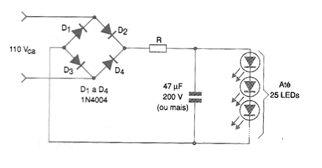 Con los LED blancos que se vuelven cada vez más accesibles y presentando rendimientos elevados es posible utilizarlos en iluminación, incluso con alimentación a partir de la red de energía. En la figura tenemos el circuito básico para la alimentación de un conjunto de hasta 25 LEDs blancos conectados en serie, obteniéndose así una iluminación ambiente de buena intensidad.