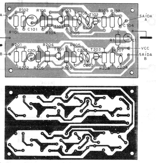 En la figura 4 tenemos el modo de hacer la conexión del circuito para operar como mezclador, donde R101 y R201 son retirados, siendo reemplazados por potenciómetros externos del mismo valor.