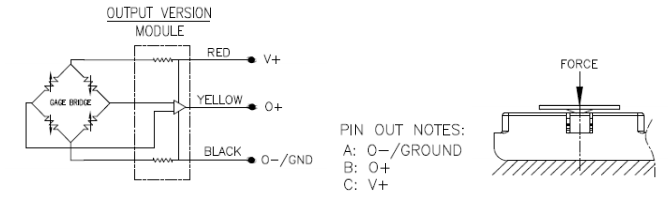 El circuito presentado en la figura 6 es sugerido por la TE Sensor Solutions que fabrica el FS20, componente básico utilizado en el proyecto. El circuito es indicado para aplicaciones en robótica, control de fuera, bombas, sensores de contacto, balanzas, etc. La alimentación se realiza con 5 V y la salida varía entre 0,5 y 4,5 V (tip) en el rango de fuerzas medidas.