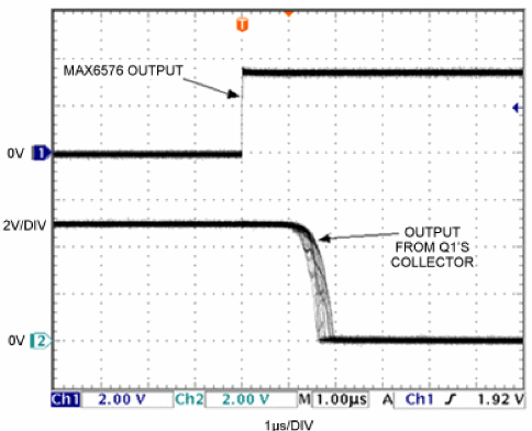 Así, la conducción de Q2 causa la conducción de Q1 el cual sigue la forma de onda de salida del colector de Q1. Este circuito tiene una forma de onda como se muestra en la figuraabajo con un jitter equivalente a 0,1º K en la conversión más rápida.