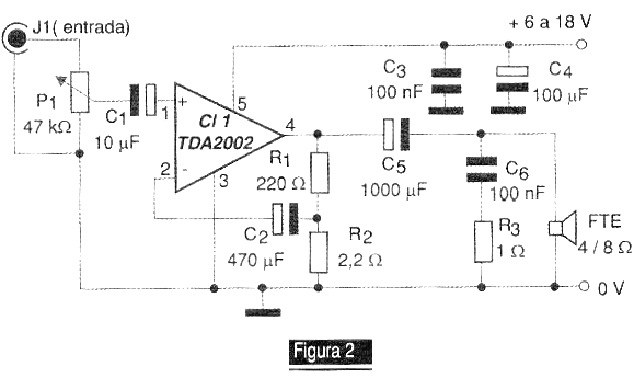El circuito integrado TDA2002 reúne en su interior todos los componentes básicos necesarios para la elaboración de un amplificador completo. Sólo los capacitores de mayor valor son externos y la red de resistores formada por R1 y R2 que determina su ganancia. La relación entre los valores de estos componentes determina la ganancia de tensión del circuito que en nuestro caso se ha fijado para 100 veces.