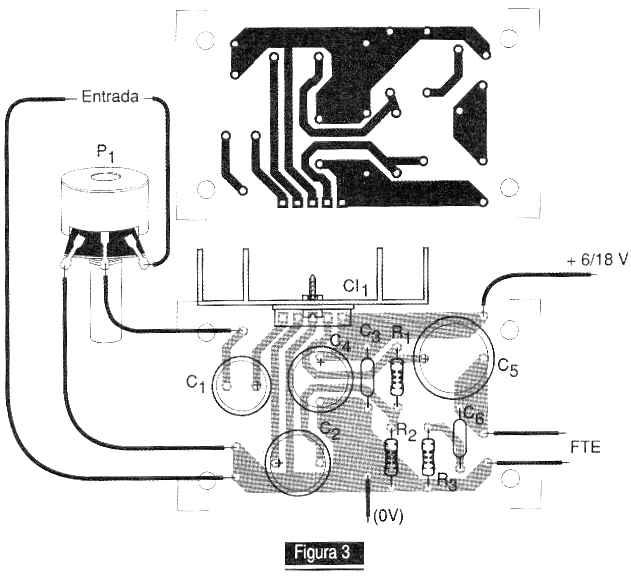 La placa de circuito impreso para el montaje de este amplificador se muestra en la figura 3.
