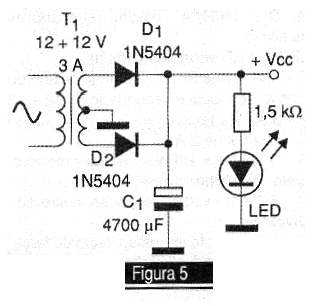 El altavoz debe ser capaz de manejar la potencia del amplificador. Recordamos que de nada sirve gastar mucho en un altavoz de 100 W cuando el amplificador sólo puede suministrar 8 W. La fuente de alimentación para el circuito se muestra en la figura 5.