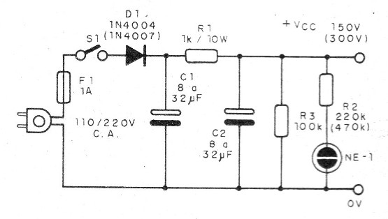 Esta fuente experimental proporciona tensiones de salida de 150 V continuas si está conectada a la red de 110 V y 300 V si está conectada a la red de 220 V. La corriente máxima es del orden de 20 mA para que no se produzcan caídas significativas en la carga y el filtrado afectadas. Podemos utilizar esta fuente en pruebas de aislamiento, circuitos experimentales con válvulas y lámparas de neón.