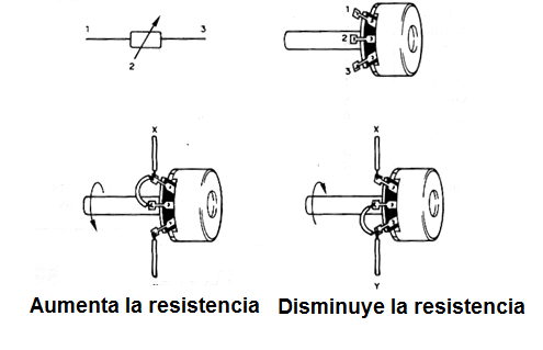 El terminal del medio corresponde al cursor y los de los extremos al elemento resistivo. Cuando giramos el cursor, la resistencia entre el cursor y uno de los terminales aumenta mientras que la resistencia entre el cursor y el otro terminal disminuye. Podemos conectar el potenciómetro de modo que la resistencia aumente cuando giramos a la izquierda o a la derecha, en cuyo caso funciona como un reóstato. Ver en la figura.