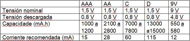 Las pilas alcalinas también tienen mayor capacidad de corriente. Así, [y posible utilizar pilas comunes en la alimentación de un proyecto, siempre que la corriente requerida esté dentro de los límites de suministro de corriente. Además, como las pilas alcalinas tienen mayor capacidad, deben durar más que las pilas comunes. La siguiente tabla proporciona las características de las pilas comunes: