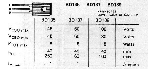 De hecho, en la mayoría de las aplicaciones, que operan con tensiones hasta unos 18 V, podemos usar cualquiera de la serie. Lo que cambia es que el BD139 tiene una tensión mayor. Así, en las aplicaciones que requieren una tensión de trabajo mayor usamos o el BD137 o BD139. La capacidad de corriente de los tres transistores es la misma, como muestra la tabla. Así, si el internauta tiene un BD137 y el proyecto solicita un BD135, puede usar el BD137 sin problemas. En esta tabla la corriente máxima es 1 A, pero en nuestros proyectos, nunca exigimos más de 500 mA de esos transistores, para que no trabajen en el límite.