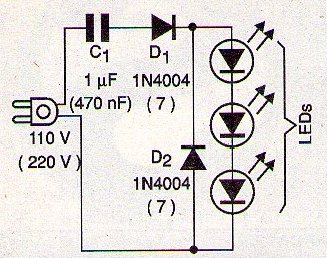 Los LEDs son diodos, es decir, conducen la corriente sólo en un sentido. Podríamos alimentarlos con corriente alterna si no fuera un pequeño problema. No soportan una tensión inversa mayor que unos 5 V. Si se polarizan inversamente con tensión alta, simplemente se quema. Por eso tenemos dos alternativas al usarlos con corriente alterna. O usamos un diodo en serie o un diodo invertido en paralelo, como muestra la figura. D1 está en serie y D2 está en paralelo. En muchos casos, podemos usar uno u otro.
