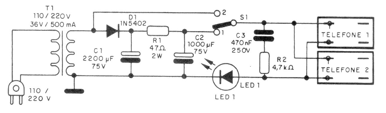 Este circuito permite simular una línea telefónica analógica para la reparación y prueba de aparatos. El circuito es de 1994 y todos los componentes usados son absolutamente comunes.