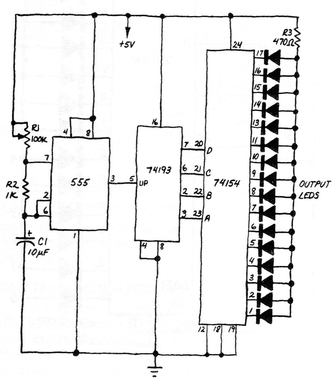Este circuito fue encontrado en una publicación americana de los años 80. En la versión original él acciona LED, pero el circuito puede ser modificado para accionar etapas de potencia. La frecuencia del efecto se ajusta en el potenciómetro y la alimentación debe realizarse con 5 V.
