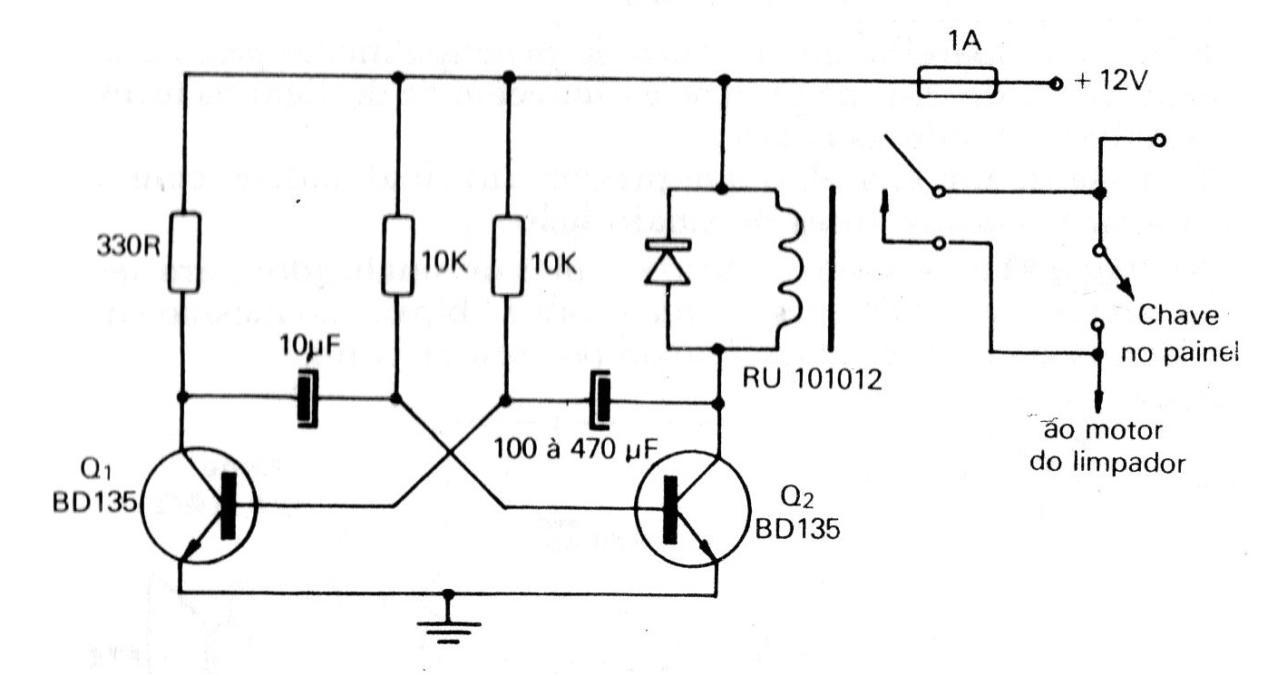 Este circuito permite accionar el limpiador en intervalos reguladores que son determinados por el capacitor entre 100 y 470 uF. Se puede añadir en serie con uno de los resistores de 10k un potenciómetro de 47k para el ajuste. El relé es de 12 V con al menos 3 A de corriente de contactos.