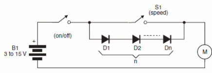 Con la llave S1 abierta el motor recibe una tensión unos 2 V menor que la suministrada por B1 rueda en un régimen suave. Para aumentar su potencia por un instante, basta con accionar S1. Se pueden utilizar de 2 a 6 diodos 1N4002 para corrientes de motor hasta 1 A. El circuito es del libro Robotics, Mechatronics y Artificial Intelligence de Newton C. Braga.