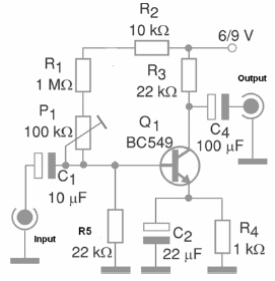 Esta configuración tradicional de preamplificador con la configuración de emisor común tiene un ajuste de polarización que permite obtener una mejor ganancia con el menor nivel de distorsión. El circuito tiene muy bajo consumo que puede ser alimentado por pilas o batería. El transistor admite equivalentes, aunque el BC549 sea de bajo nivel de ruido.