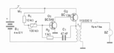 Este sistema experimental de comunicación telegráfica puede tener cables de conexión al auricular de varios kilómetros de longitud. El auricular es de tipo piezoeléctrico y la frecuencia del tono emitida se ajusta en el potenciómetro. El circuito opera con una alta tensión de línea. El transformador tiene un secundario de 6 a 12 V con corriente de 100 a 500 mA. El circuito es del libro Science Fair Projects de Newton C. Braga, publicado en los Estados Unidos.