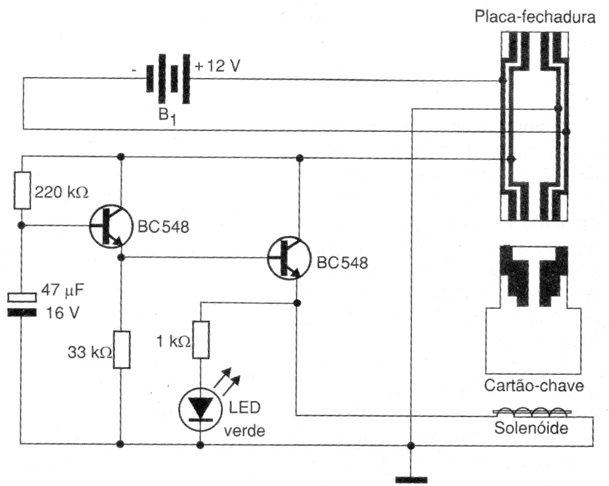 Este circuito sustituye con seguridad las cerraduras comunes, ya que, en lugar de la llave, la apertura se realiza con la ayuda de una tarjeta hecha con una placa de circuito impreso. El elemento de bloqueo es el núcleo de un solenoide que deberá estar encajado en la lengüeta de la puerta cuando el circuito esté apagado. La placa de la cerradura debe ser instalada de modo que sus puntas queden en lados opuestos de la puerta de modo que pueda ser abierto por dentro y por fuera. Asegúrese de que las pistas de la tarjeta y de la tarjeta deben seguir el modelo presentado para que la tarjeta de llave pueda conectar la alimentación del circuito al hacer contacto con las placas de la cerradura. Para abrir, basta introducir la tarjeta en la ranura donde deberá estar instalada la placa de la cerradura y aguardar el LED encenderse (30 segundos). Cuando esto suceda, la cerradura se abrirá. Para cerrar, inserte la tarjeta y cierre la puerta. Luego retire la tarjeta y el LED apagará indicando el bloqueo del solenoide. La batería tendrá una larga duración ya que sólo entra en funcionamiento durante los pocos segundos en que la tarjeta esté encajada.