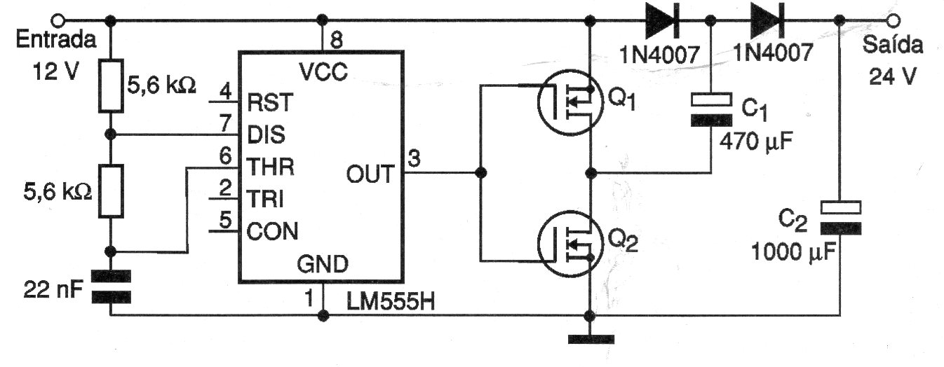 Este circuito tiene un buen rendimiento en la conversión de 12 V en 24 V. El circuito utiliza dos FET de potencia, lo que permite obtener una buena corriente de salida. Encontramos esta configuración en una documentación de 2006.