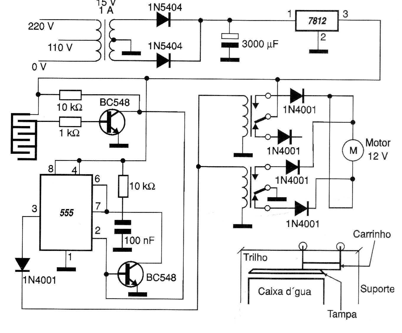 En este circuito, tenemos un sensor que consiste en una placa de fenolite con un laberinto de filetes que no se toca. Cuando el circuito entra en contacto con el agua, ocurre el accionamiento del 555 que genera un reloj. Este reloj actúa sobre los relés determinando el sentido de rotación del motor. El tiempo que el motor quedará conectado está determinado por los valores de R y C conectados a los pines 6 y 7 del circuito integrado 555. Los relés utilizados deben poder controlar el motor de 12 V, y en el caso, máximo 1 A de corriente que es la capacidad del 7812. El circuito integrado 7812 debe montarse en un radiador de calor.
