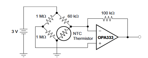 Obtenido en el propio manual del componente de Texas Instruments, este circuito se utiliza con un NTC para la medida de temperaturas. Observe que el puente se alimenta con 3 V.