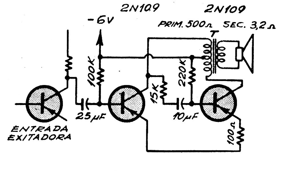 Este es un antiguo circuito tradicional clase B con transistores, utilizando un transformador de salida para proporcionar potencia de algunas decenas de miliwatts a un altavoz pequeño. Podemos implementar este paso con transistores PNP más modernos, cambiando la resistencia de 100 k y 220 k. El transformador de salida se puede obtener en un viejo radio transistorizado.
