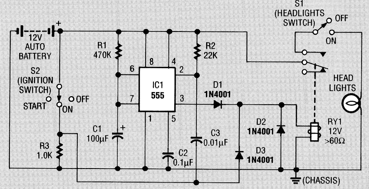 Poptronics recomienda este circuito para uso en el coche cuando los faros se olvidan conectados. El circuito utiliza relé sensible con corriente de contacto de acuerdo con los faros.