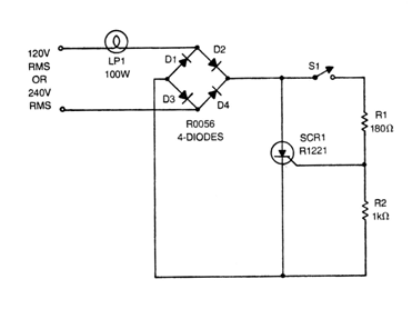 Este circuito sólo sirve para cargas resistivas como lámparas incandescentes. Los diodos del puente pueden ser los 1N4004 o 1N4007 para cargas de hasta 100 W. El SCR puede ser cualquiera de la serie TIC según la carga y la tensión de alimentación. El circuito no tiene aislamiento de la red y la corriente en el conmutador es muy baja.