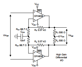 El amplificador operacional utilizado es de Texas Instruments y este circuito es sugerido en su datasheet. El circuito es indicado para aplicaciones en instrumentación presentando características de alta ganancia y elevada impedancia de entrada.
