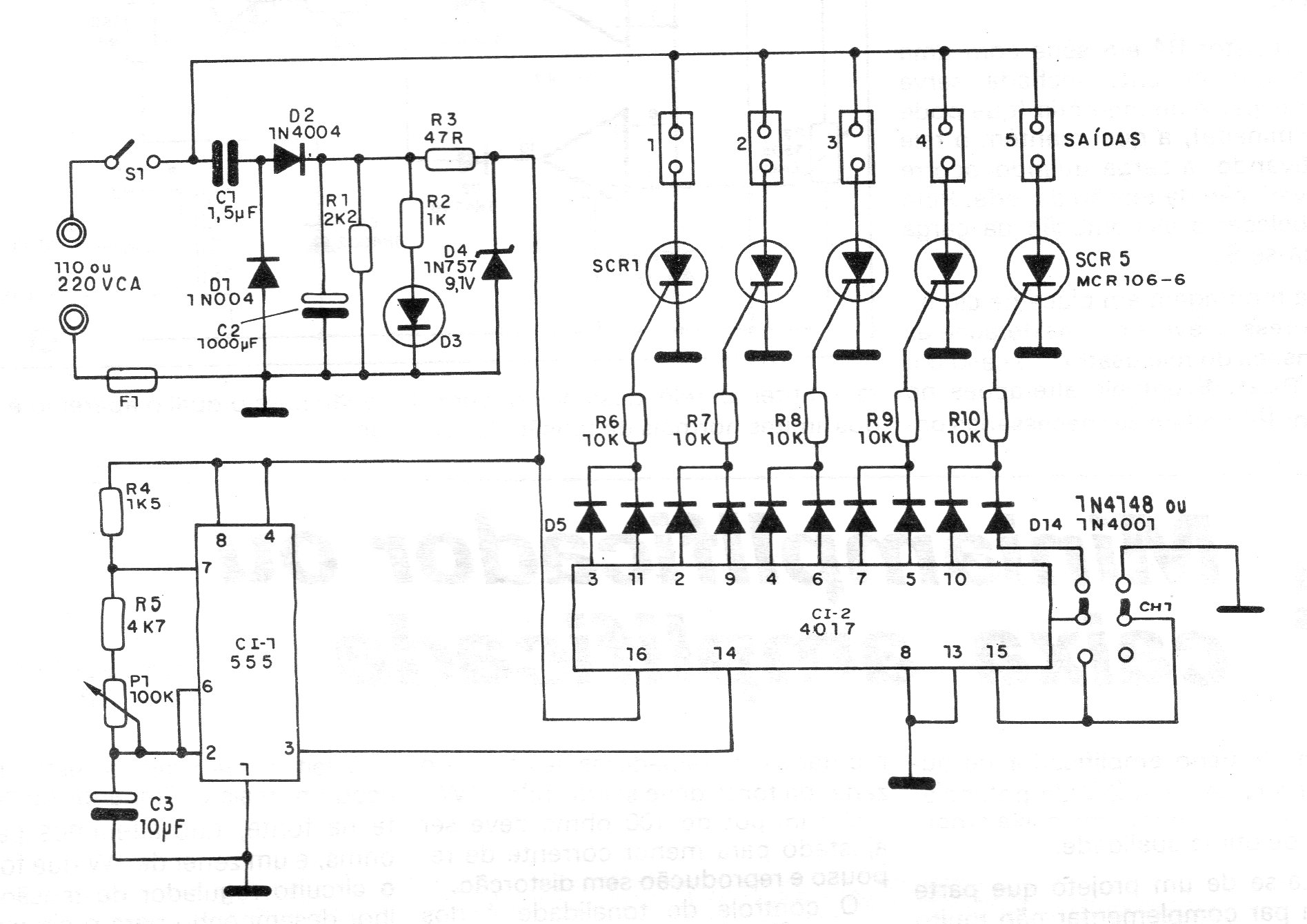 Este circuito controla lámparas incandescentes hasta un total de 200 W por canal. Los SCR deben montarse en disipadores de calor y el circuito incluye una fuente sin transformador. Encontramos este circuito en una documentación de 1987. La velocidad del efecto se ajusta en P1.