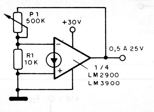 En la figura tenemos un circuito que nos permite obtener una tensión variable de aproximadamente 0,5 a 25 V, usando uno de los cuatro amplificadores disponibles en los LM3900 y LM2900. El potenciómetro P1 permite ajustar esta tensión con precisión y la alimentación se realiza con una fuente simple de 30 V. Se deben observar las limitaciones para la corriente de salida con el uso de un controlador para los casos en que se necesita mayor potencia.