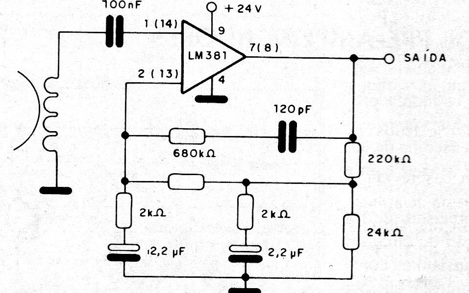 Este circuito utiliza un amplificador de National Semiconductor, poco común en nuestros días. Los números entre paréntesis son para el segundo canal. El circuito está indicado para antiguos grabadores de cintas de rodillo.