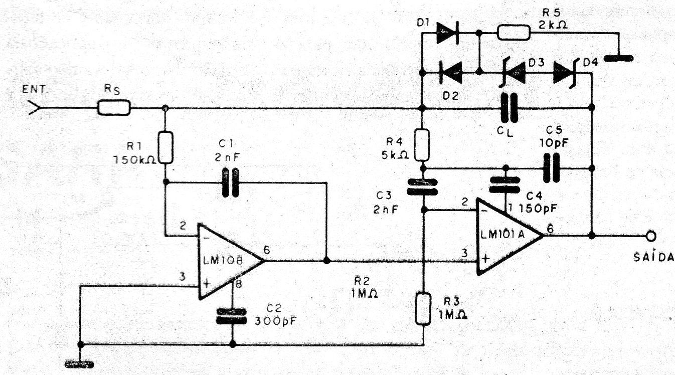 El integrador de la figura se caracteriza por la baja corriente de entrada y se basa en un LM101A. C1 determina las características de integración junto con los diodos zener en oposición, que dependen de las características de intensidad de la señal trabajada. La fuente de alimentación debe ser simétrica e integrados equivalentes se pueden utilizar.