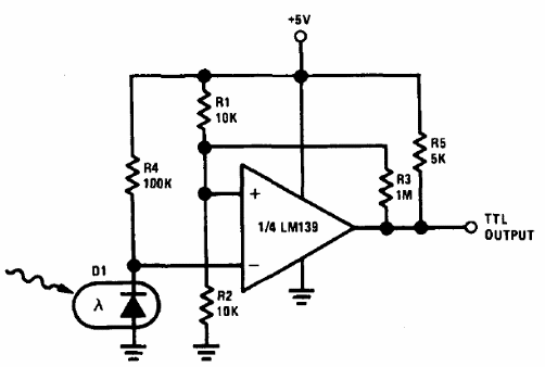 El circuito mostrado, para lectura de papel perforado o presencia de papel, fue sugerido por National Semiconductor en su Linear Applications Handbook. El circuito tiene salida compatible TTL siendo alimentado por fuente de 5 V