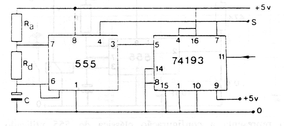 Un tiempo muy largo puede obtenerse con la ayuda de un circuito integrado TTL adicional. La alimentación debe ser hecha con 5 V y el tiempo es dado por el ciclo del astable 555 a través de Ra, Rb y C. El circuito es de una documentación de los años 70.