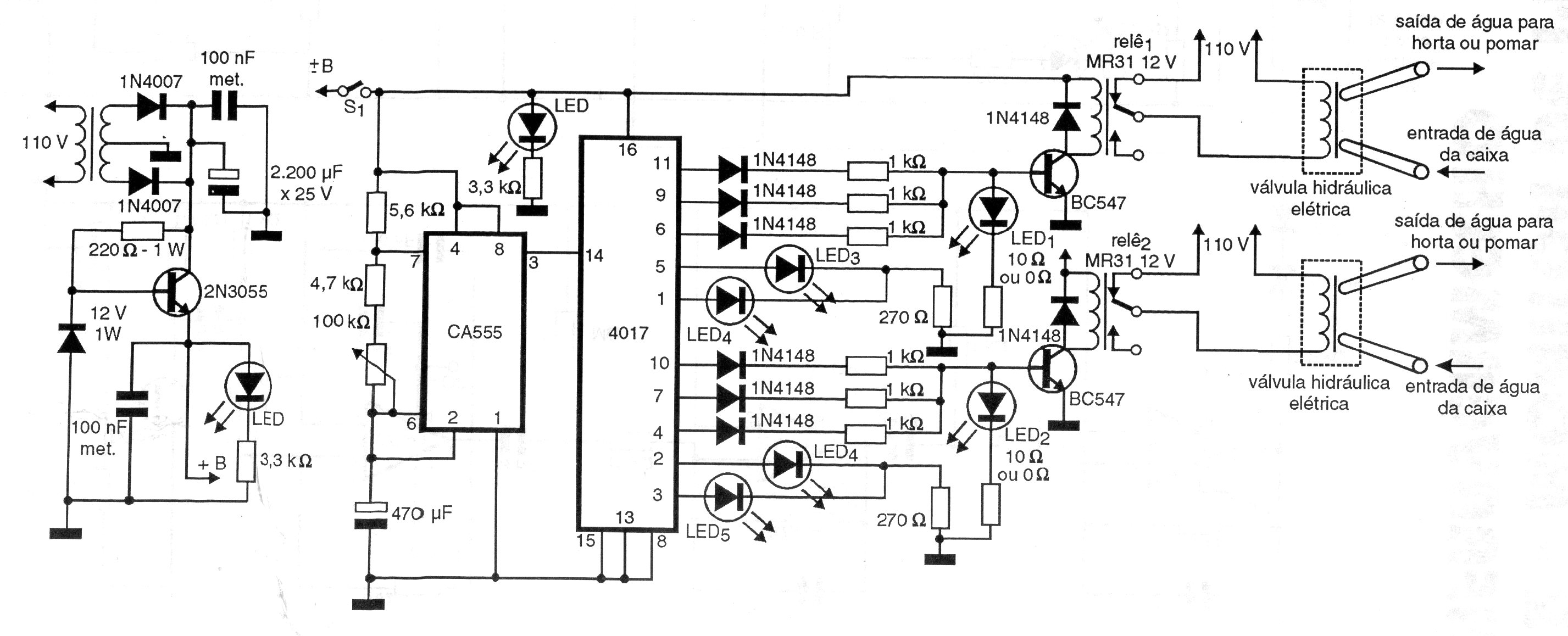 Este circuito, encontrado en una documentación de 1998, acciona de modo automático válvulas solenoide en un sistema de riego. El circuito consiste en un temporizador para accionamiento con tiempos programados por el potenciómetro junto al 555.