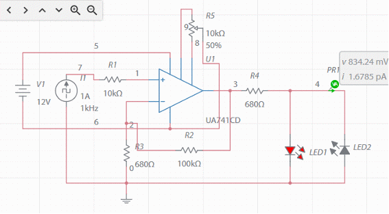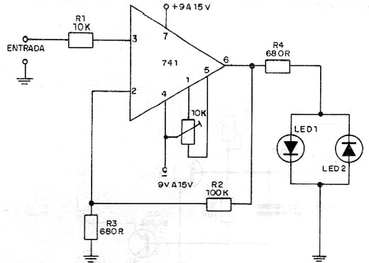 Esta es una interesante aplicación basado en el circuito integrado 741, pero otros amplificadores operacionales se puede utilizar. Las luces LED depende de la polaridad de la señal de entrada. El voltaje de la señal debe ser inferior a la utilizada en el circuito. Ver esa fuente simétrica se debe utilizar en su comida. Los LEDs pueden ser de cualquier color, y el valor de R4 dependerán de la tensión de alimentación deseada y actual sobre LEDs.