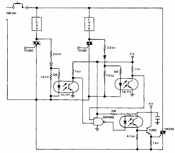 El propósito de este circuito del Thyristor Gating for uP Applications de Texas Instruments es impedir que dos triacs sean disparados al mismo tiempo. Los triacs son de acuerdo con las cargas controladas y los acopladores ópticos equivalentes pueden ser utilizados.