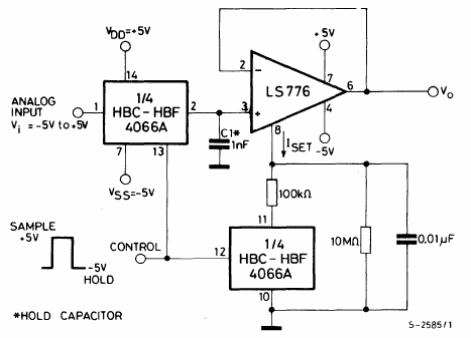 Este circuito es del manual de circuitos integrados lineales de la SGS de 1982. El LS776 no es muy común actualmente, pero se puede utilizar un operacional equivalente más moderno. La fuente de alimentación debe ser simétrica.